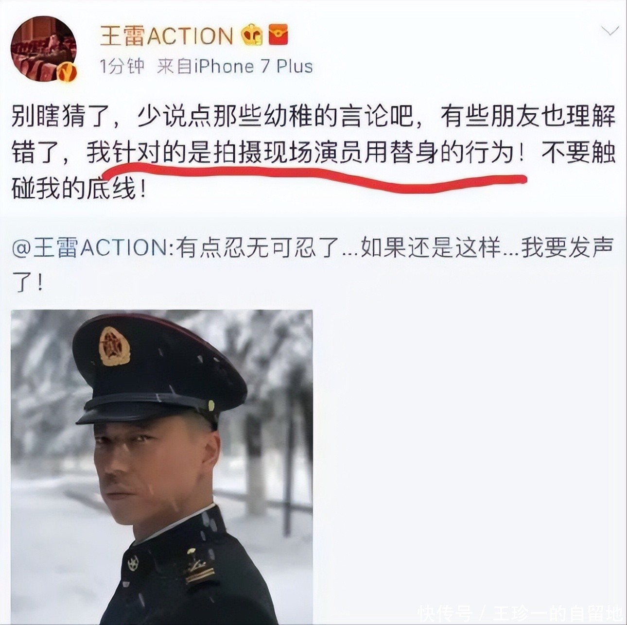 当时在拍摄现场有演员用替身,王雷看不下去了,忍不住在网上吐槽了一下。