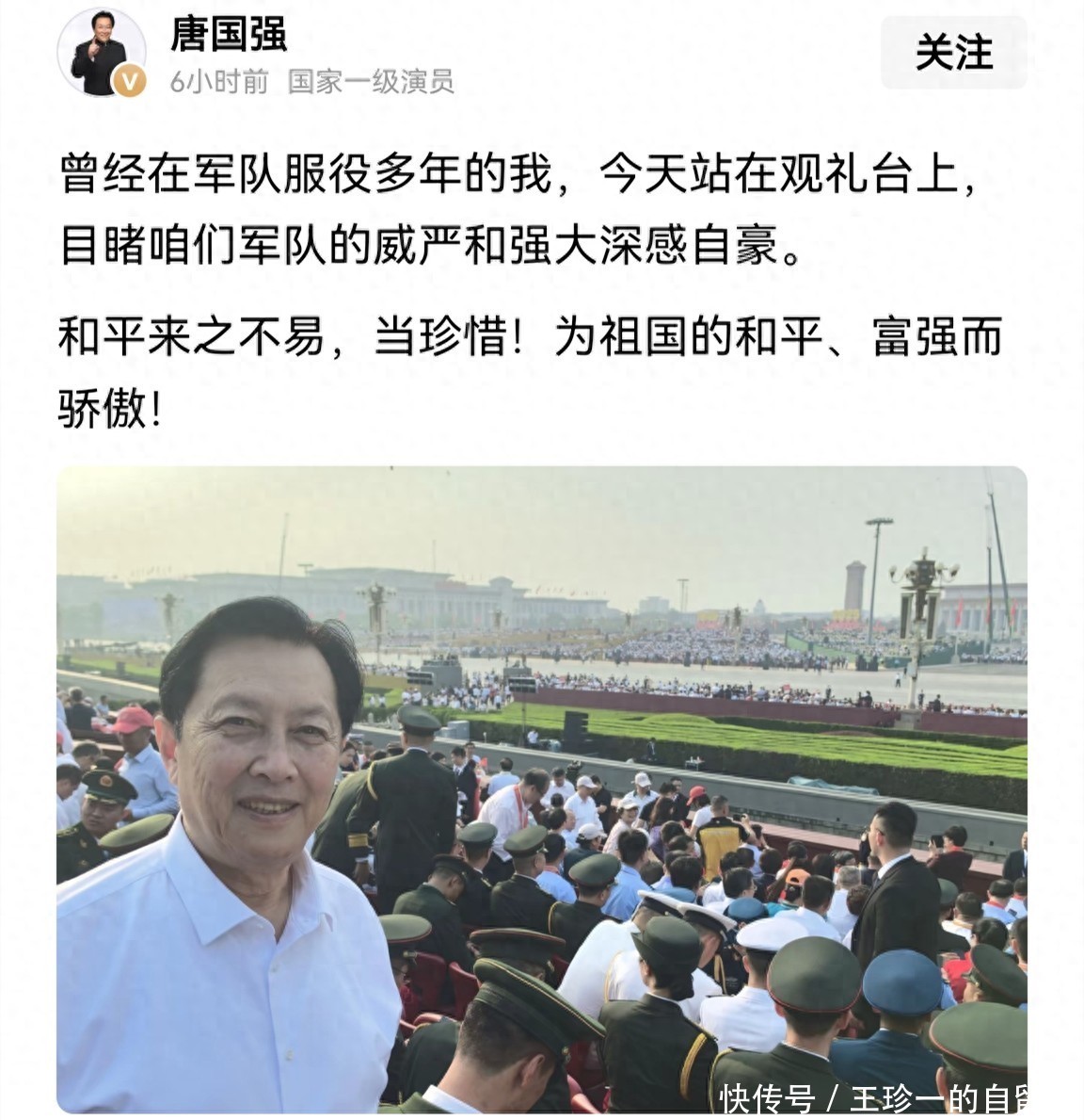 第一位:唐国强此次受邀观礼,唐国强十分激动。在观礼结束后,他在社交账号发文“和平来之不易,当珍惜!为祖国的和平、富强而骄傲!”