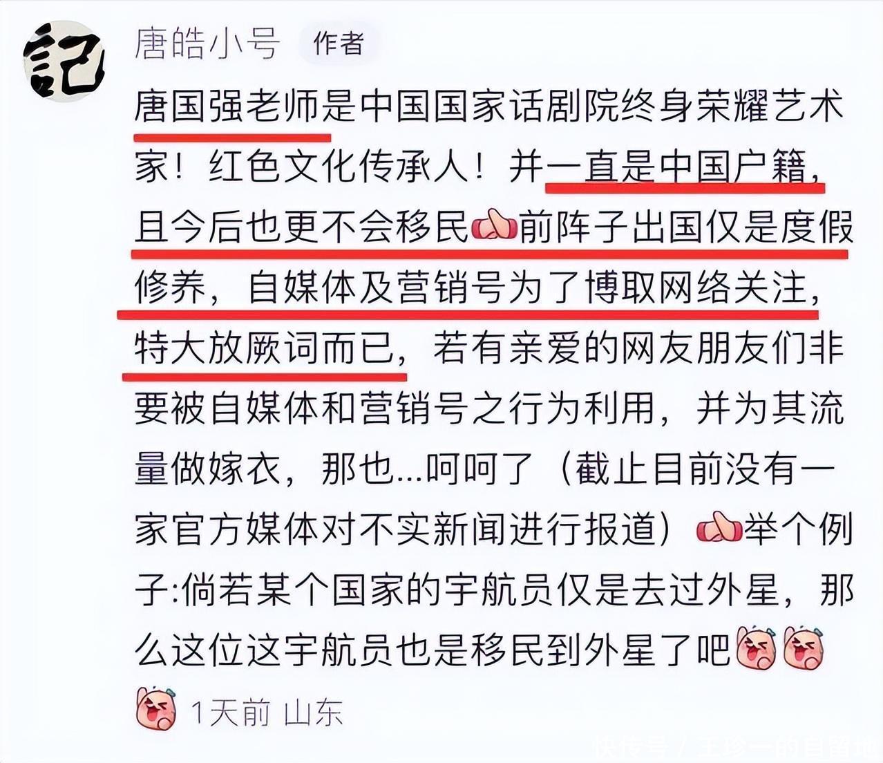 前几年唐国强移民传闻闹得沸沸扬扬的时候,他的经纪人特意发声辟谣了。